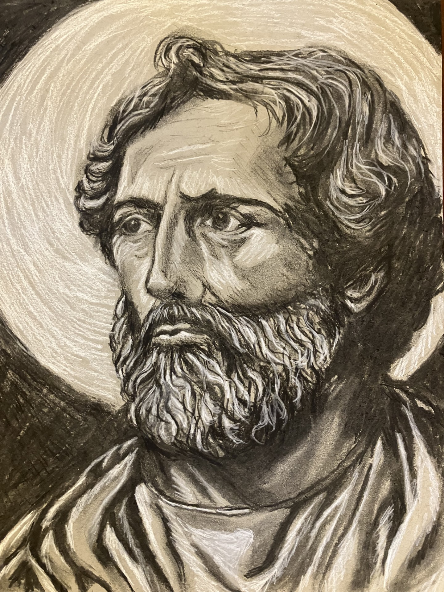 We will then choose a child of God, someone whose faith we look up to in our life or in the Bible, whose portrait we want to see in black and white charcoal. I did a portrait of my husband, Dennis Allen, a beautiful man of God I admire for many reasons. I also did one of St. Peter as I have always been fascinated by his faith and his letters in the New Testament. Both of these drawings were prayerful to meditations, as your drawing also will be to you.